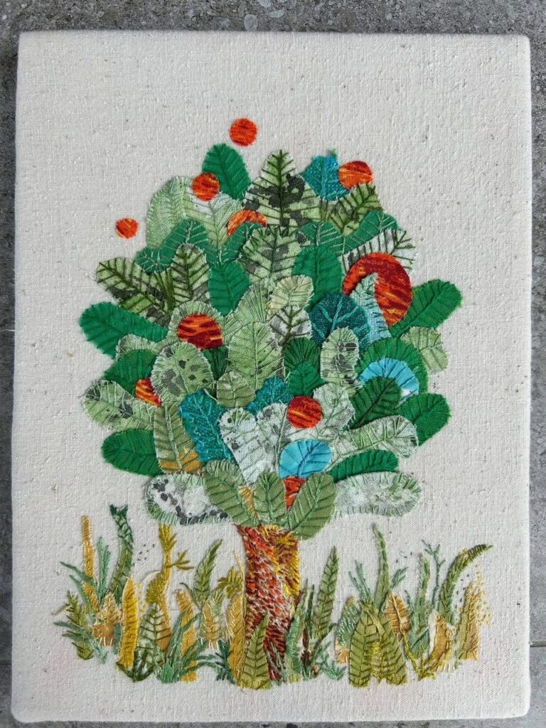 Kerstin Torstensson skapar färgrika textila bilder av återbrukade, infärgade tyger med inslag av fritt broderi.